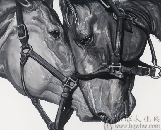 “人生是短暫的,但藝術是永恒的。”以“白駒過隙”為展覽標題,孫浩不無感慨。作為當代青年水墨的代表,孫浩的近期創作逐漸走向了多元而豐富的面貌,在這些多元面貌的背后則是畫家的個性獨立與自由思考。在本次展覽展出的作品中,以《相濡以沫》為代表的畫作,呈現了孫浩對現實生活的切入和討論,頌揚真摯和樸素的情感,挖掘人性的本質和生命的真實意義。展覽中的兩張巨幅人物肖像,則延續了孫浩在2014年的“青年藝術100”北京啟動展上展示的作品《父親》的探究方向與視覺震撼力,但具有了一定的抽象性,放大了寫意的表現張力,將整個畫面有機地組織為激情四射、酣暢淋漓的水墨交響。《東風起》與《紅拂駒》一脈相承但又有所不同,孫浩藉助奔馬的姿態表達和披風的翻卷飄動來增強畫面動勢,給予觀賞者更為激情而浪漫的美好印象,引發觀賞者的浮想聯翩和詩意體會。《紅騎士》結合了“肖像化”的處理以及“史詩般”的氣質,作品向“擬人化”、“寓意化”方向更有力地邁進。